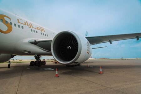 Male, Maldives - July 30, 2017: Engine of Boeing 777 of Emirates Airlines at Velana International Airport in Male, Maldives.