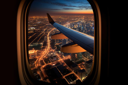 Breathtaking view of city skyline at twilight, captured through an airplane window during ascent.