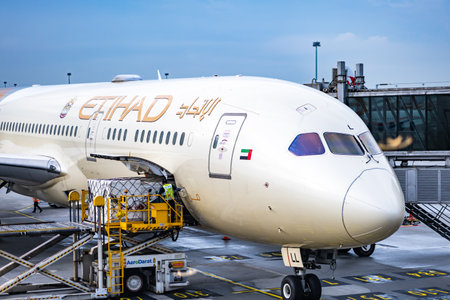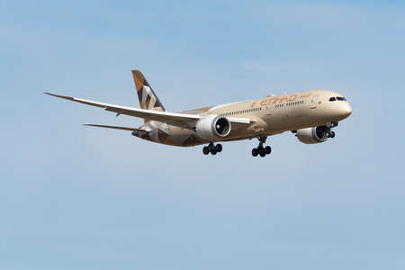 Zurich, Switzerland, February 24, 2022 Etihad Airways Boeing 787-9 Dreamliner final approach on runway 14