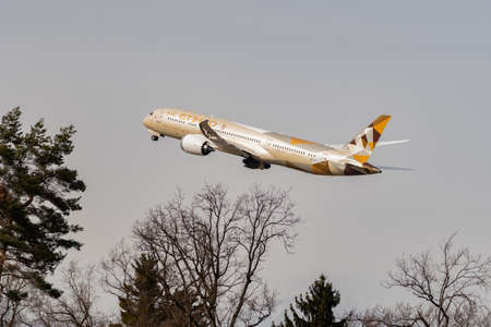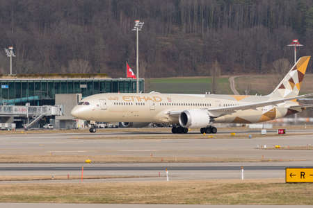 Zurich, Switzerland, February 24, 2022 Etihad Airways Boeing 787-9 Dreamliner aircraft is departing from runway 28