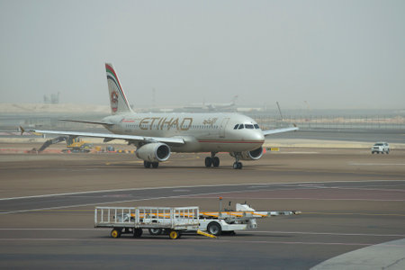 Abu Dhabi, UAE - December 2022: Etihad aircraft on runway at Abu Dhabi International Airport.