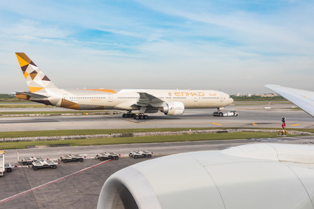 BANGKOK, THAILAND - NOVEMBER 28, 2017: Etihad Boeing 777 on taxiway at Suvarnabhumi airport pulled by a tug to departing position. View from over wing seat on a Boeing 777, B777.