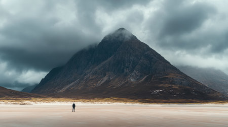 A solitary person stands at the foot of a magnificent mountain, surrounded by dramatic clouds and vast open space, evoking a sense of loneliness.