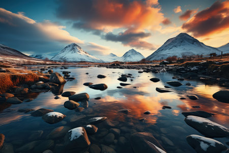 Beautiful scenery of majestic mountains and rocky river in sunset sky with dramatic clouds. Made with Generative AI