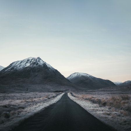 A road cutting through the dramatic landscapes of Scotland's Highlands, with room for your message
