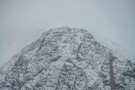 Foggy mountain landscape with white snow on black rocks in cloudy sky. Misty mountain minimalism of snowbound mountain top in low clouds. Minimalist nature background of snowy mountain peak in fog.