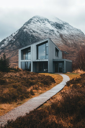 Modern house in Scotland, UK. Wooden path leading to the house.