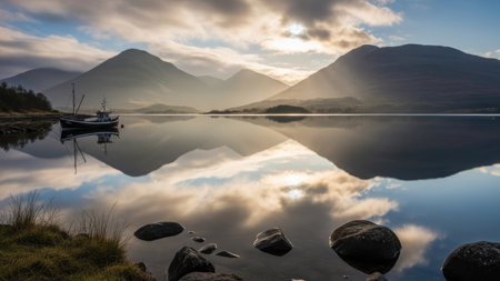 a stunning sunrise over a picturesque glen, captured in ultra high resolution. the mountains are adorned with clouds, while godrays pierce through the morning mist, creating a magical and epic atmosphere. this breathtaking image was taken with a wide angle lens on a hasselblad camera. ai generated