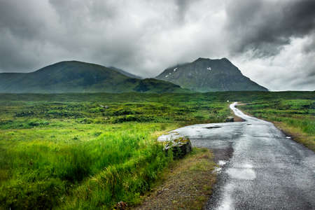 Along the West Highland Way. A small rain-soaked road seems to lead across the moor towards the Stob a Ghlais Choire mountain that emerges from the clouds