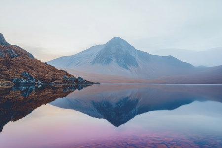 A breathtaking view of a mist-covered lake at dawn surrounded by majestic mountains, reflecting calm waters that create an atmosphere of tranquility in nature.