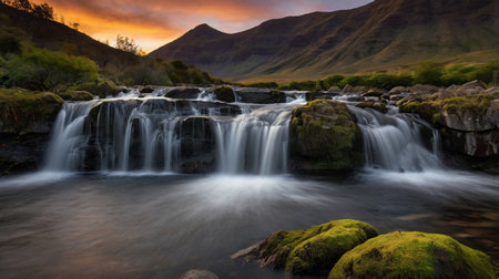 Golden sunlight spills over the mountains as a tranquil waterfall cascades down rocks. The vibrant sky is filled with shades of orange, pink, and purple, creating a peaceful atmosphere.