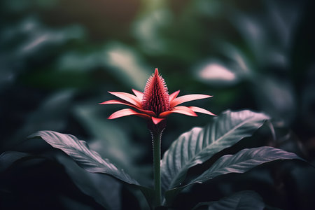A vibrant red ginger flower standing tall amidst lush foliage in a tropical rainforest.