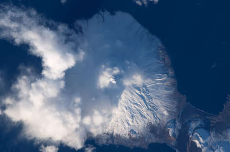 An aerial view shows a snow-covered volcano with an active eruption, releasing a plume of smoke. The image displays a dramatic contrast of cool white snow against the dark volcanic rock and a bright blue sky. The scene is illuminated by daylight, suggesting potential use for environmental or adventure themed projects.