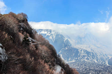 A beautiful scenery of a snow-covered mountain under the white clouds