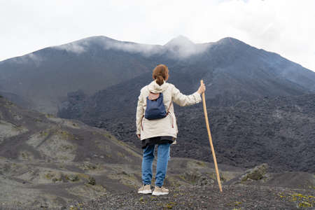 The woman is looking at the top of the Pacaya volcano in Guatemala.