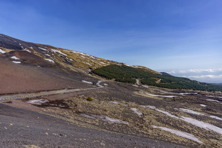 Mount Etna in Sicily, Italy. View of ash, solidified lava and residual vegetation.