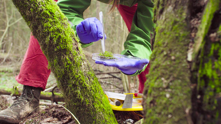Close-up scientist examining sampling of toxic chemicals on polluted ground