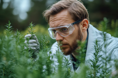 A scientist in protective gear examines plants in a lush natural environment. The image highlights the importance of environmental research and safety in scientific exploration.