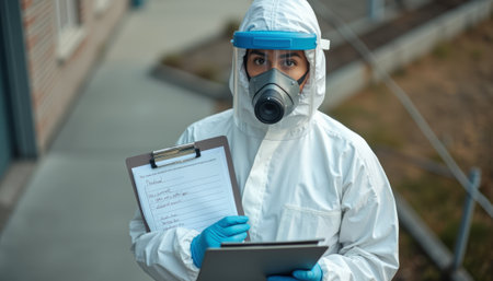 A healthcare professional, dressed in a full protective suit and mask, stands outdoors holding a clipboard and tablet. This image captures the dedication and vigilance of frontline workers in the fight against health crises, emphasizing their commitment to safety and care.