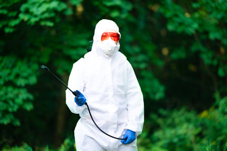 A worker sprays pesticides on trees outdoors. Tree pest control. Insect pest control.