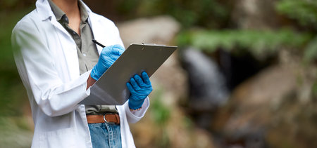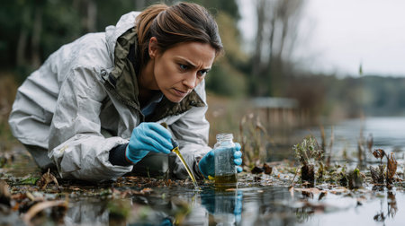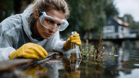 A dedicated scientist in protective gear conducts a water quality test by the lake, emphasizing the importance of environmental research and conservation efforts.