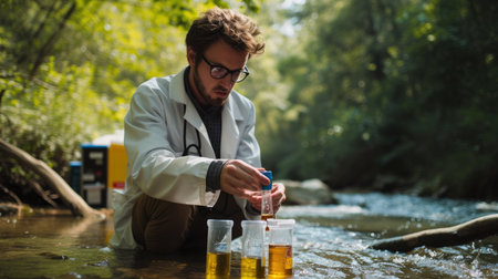 A dedicated environmental scientist dressed in protective gear collects a water sample from a serene stream, showcasing commitment to ecological research and analysis.