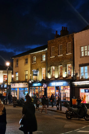 London, UK, December 14, 2025: Vibrant Nightlife in an Urban Street with Illuminated Buildings and Busy Pedestrians