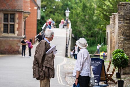 Cambridge, UK, August 1, 2019. Elderly couple walking down the street. Rear view of elderly couple walking at Cambridge