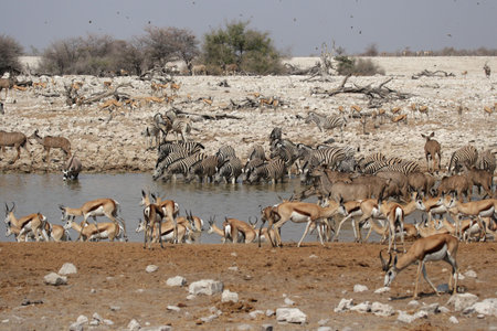 Animals drinking at the waterhole of Okaukuejo in the Etosha National Park, Namibia