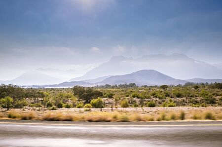 Beautiful mountainous landscape from a moving car driving on a tar road, Cape Town, South Africa