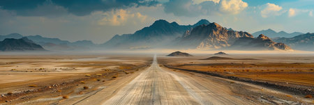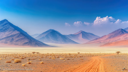 A serene desert landscape with mountains and a dirt road under a blue sky