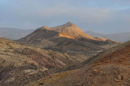 Desert landscape at sunrise. Hiking desert part of Israel National Trail. Negev desert . Valley. Colorful sands