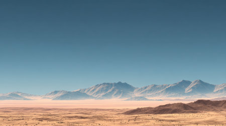 Serene arid landscape showcases rugged mountains under a clear blue sky, highlighting the vast beauty of the desert and its tranquil environment, perfect for exploration.