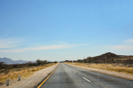 inviting tar road leading to mountainous back ground in Namibia, Africa