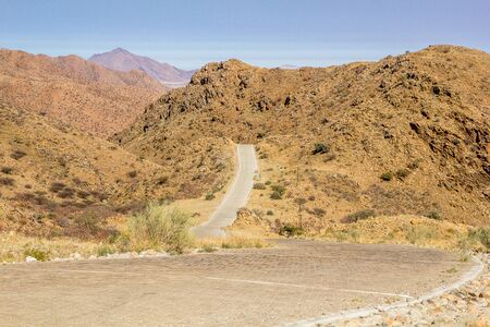 Deserted rocky road in perspective in hot desert foothills under bright blue sky