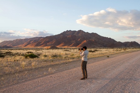 Young woman is photographing the sunrise in the park Sossusvlei, Namibia