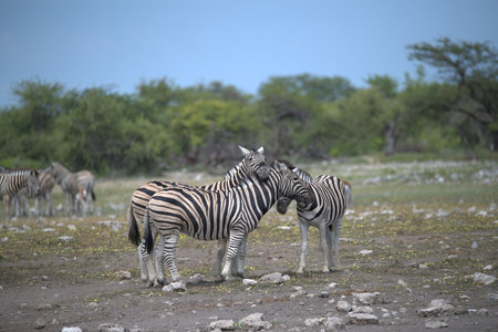 A group of plais zebras (Equus burchellii) near the pan in Etosha National Park, Namibia.