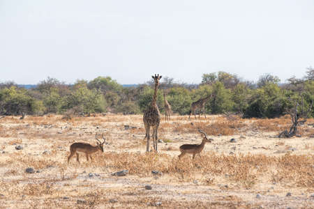 Giraffe and Oryx walking in the bush. Wildlife Safari in the Etosha National Park, famous travel destination in Namibia, Africa.