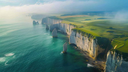 Misty morning landscape of the Natural white chalk cliffs in Etretat, Normandy, France, La Manche or English Channel, on the Coast of the Pays de Caux area.