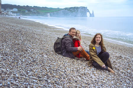 happy smiling dad and two daughters sitting on the beach of Etretat. France