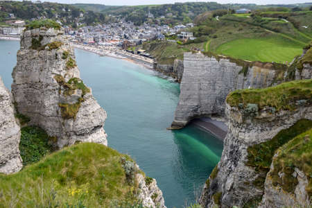 Landscape with scenic alabaster chalk cliffs of Etretat and coast of Atlantic ocean, travel and vacation destination in Normandy, France
