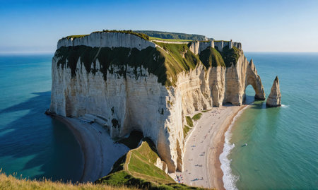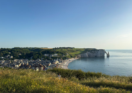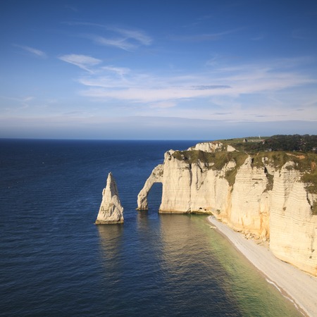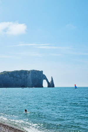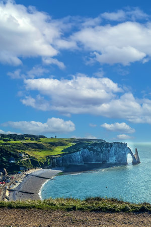A view of the famous ?tretat cliffs and natural arch in Normandy, France, on a clear summer day