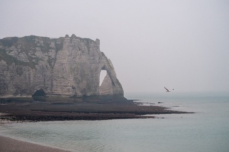 The needle in the chalk cliffs of the Normandy coast of Etretat, France, on a grey misty day