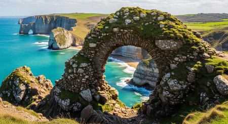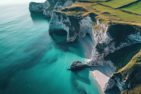 Dramatic Chalk Cliffs with Natural Arches and Verdant Fields from Above