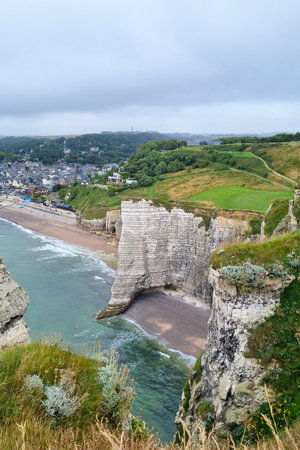 coastal landscape along the Falaise d'Aval the famous white cliffs of Etretat village with the Porte d'Aval natural arch and the rock known as the Aiguille d'Etretat