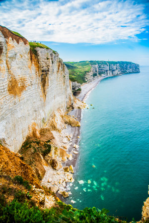 Scenic landscape of Etretat cliffs, iconic landmark of Normandy Coast, Falaise d'Amont, on late afternoon, France