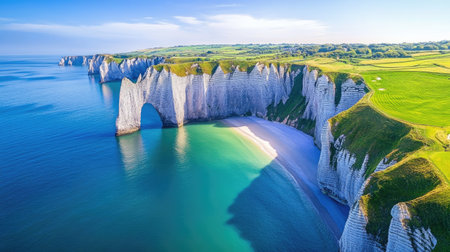 Scenic view of the iconic cliffs in normandy, france, showcasing dramatic white limestone formations against the vibrant blue sea. lush greenery and coastal town in the background highlight nature's raw beauty.