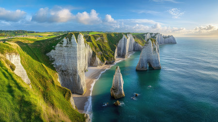 The breathtaking cliffs of Etretat, framed by the deep blue of the English Channel and the vibrant green of the surrounding landscape, captured in a panoramic view.