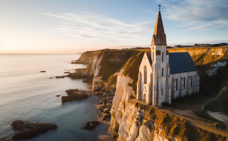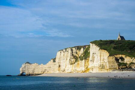 Sightseeing view to Etretat coastline with the famous Notre-Dame de la Garde chapel on the Amont cliff. Pebble beach washed by Atlantic ocean waters, Normandy, France