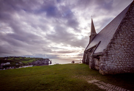 Historical church of Our Lady at Étretat, which is best known for its chalk cliffs, including three natural arches and a pointed formation called Aiguille or the Needle